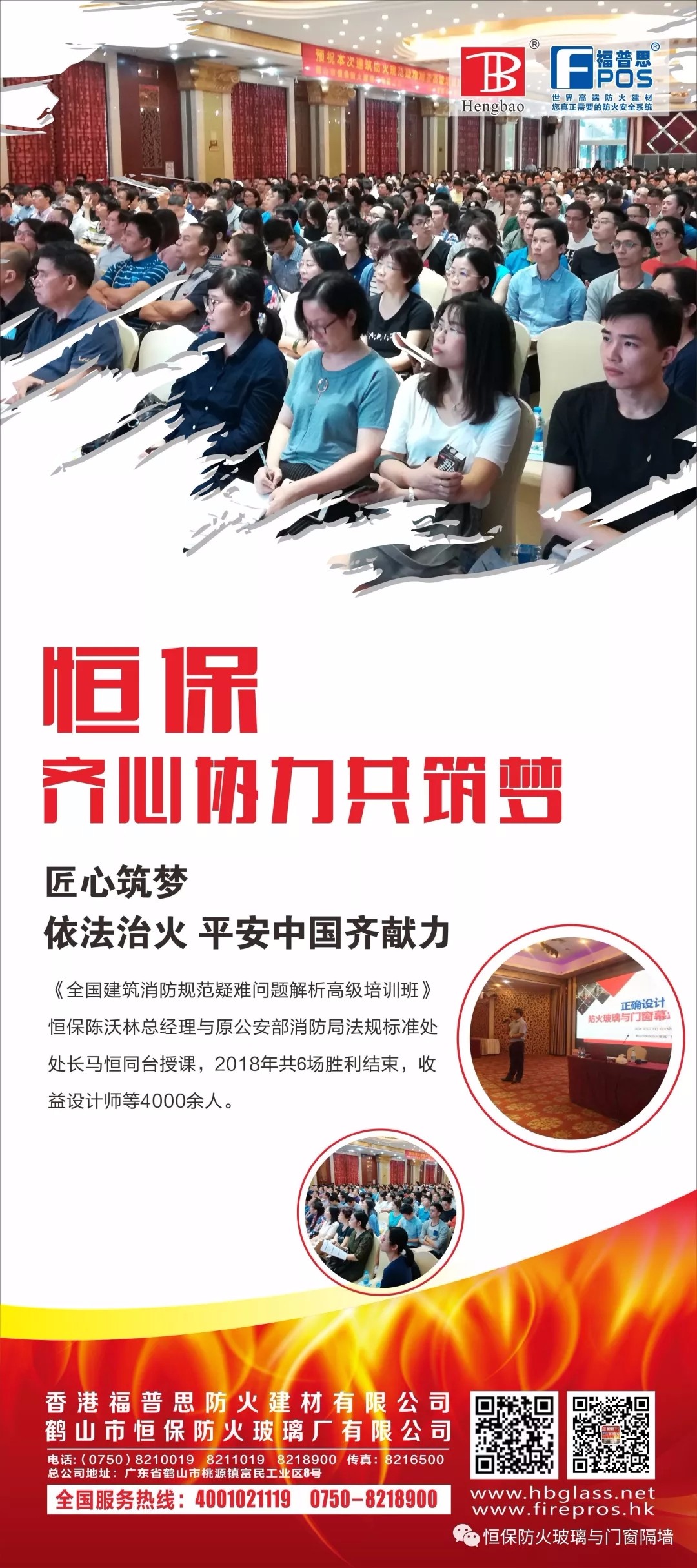 鶴山市恒保防火玻璃廠有限公司2018年與“中國建筑設(shè)計研究院人才培訓(xùn)中心”原公安消防局法制標(biāo)準(zhǔn)處處長馬恒一起分別廣東深圳、湖南長沙、湖北武漢、廣西南、山東濟南、廣東廣州,共同舉辦了6場《全省建筑消防規(guī)范疑難問題解析高級培訓(xùn)班》,所到之處深受到設(shè)計師們的歡迎,受益設(shè)計師達4000多人次。