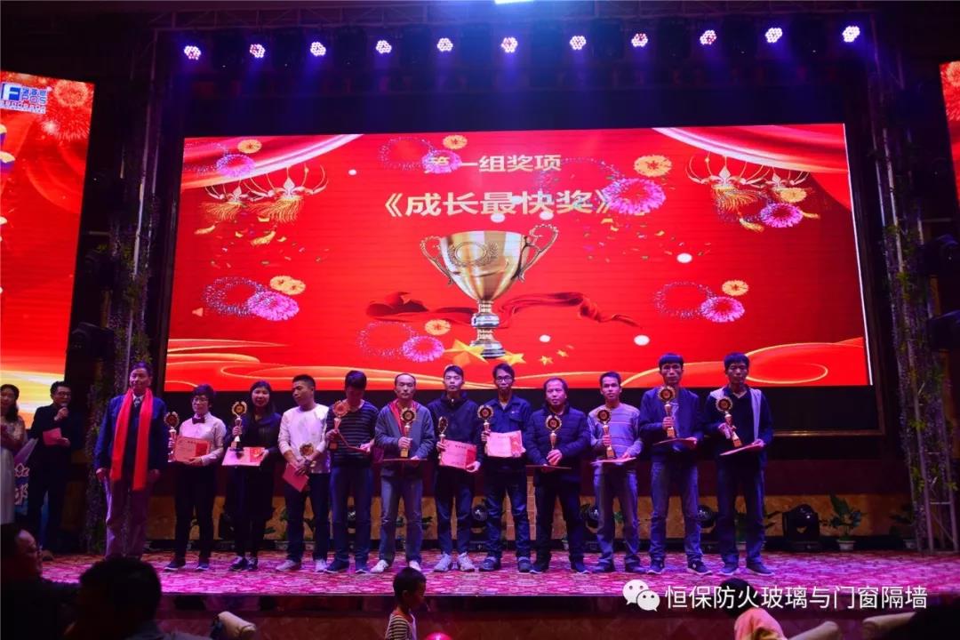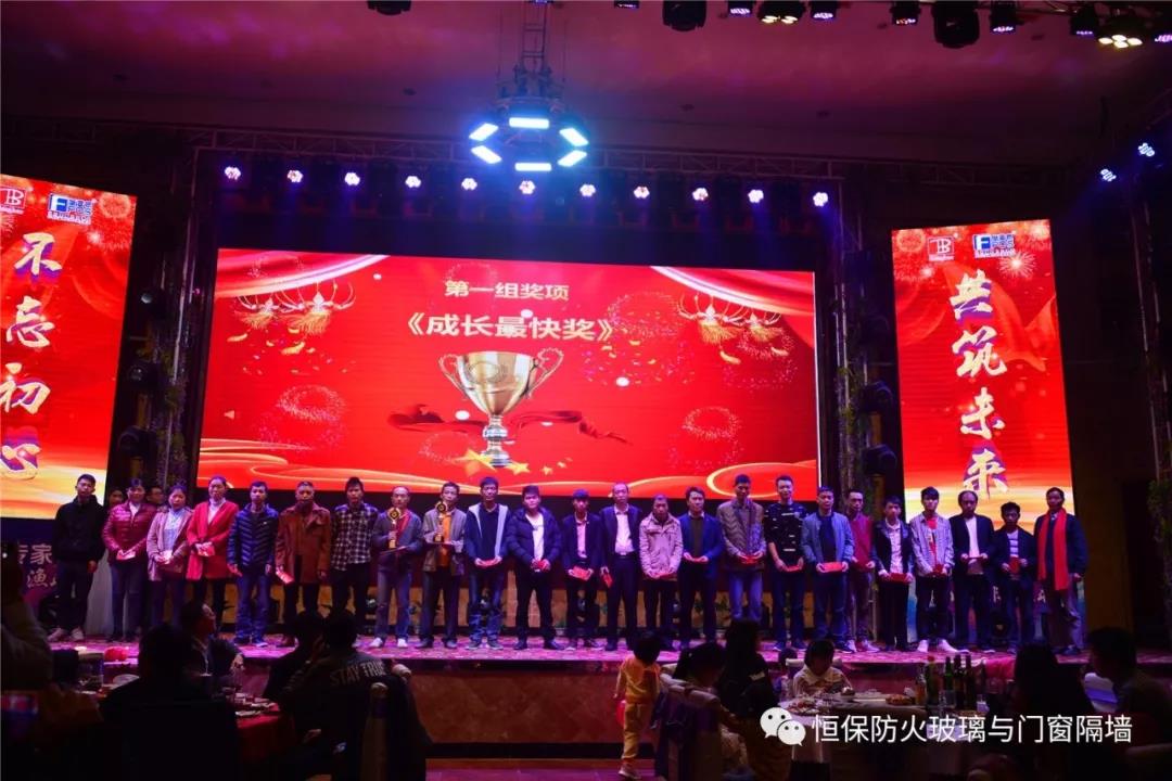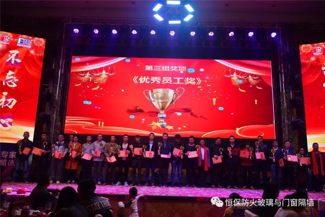 19:30分,恒保年會在鼓舞飛揚中拉開了帷幕,首先是恒保總經理陳沃林先生做年終致辭,陳總回顧了2018年所取得的成績與不足,并提出了2019年恒保要全力以赴,不忘初心,繼續奮斗,再創佳績的戰略方針。2018年是恒保跨越發展的一年。全體恒保家人,團結一心,艱苦奮斗,全力實現了公司既定的年度目標,同比各項重要指標增長逾80%。2018年我們大力引進新設備,開發新產品10多項,產品通過國家檢測20多項 ,至此,恒保出品已擁有37個3C認證,158份檢驗報告,成為行業內公認通過國家檢驗、認證最多的防火玻璃門窗企業;2018年在行業各類權威獎項評比中,榮獲“全國鋁門窗幕墻展 年度星品獎”、榮獲“新玻網 門窗玻璃十強企業”、陳沃林總經理榮獲鶴山市工商聯系統“工匠之星”稱號、陳沃林總經理榮獲第五屆中國玻璃行業“玻璃工匠”稱號、榮獲第三屆建筑門窗金軒獎“最具創新力配套產品”、榮獲第三屆建筑門窗金軒獎“最具發展潛力企業”、榮獲中國門窗幕墻行業“科技進步推動獎”等十多項獎項。2019年我們將持續優化各部門管理,提高員工工作技能、提高生產管理水平、提高生產效率、提高綜合管理能力,減少物料損耗,減少出錯率。加強精密型材、新型防火門窗的開發,滿足不同客戶的需求。2019年恒保上下一心、同心協力、不忘初心,共筑未來,為實現中國平安夢、世界平安夢繼續奮斗!