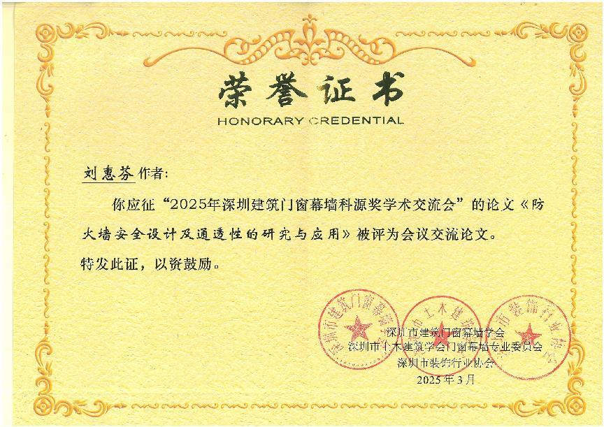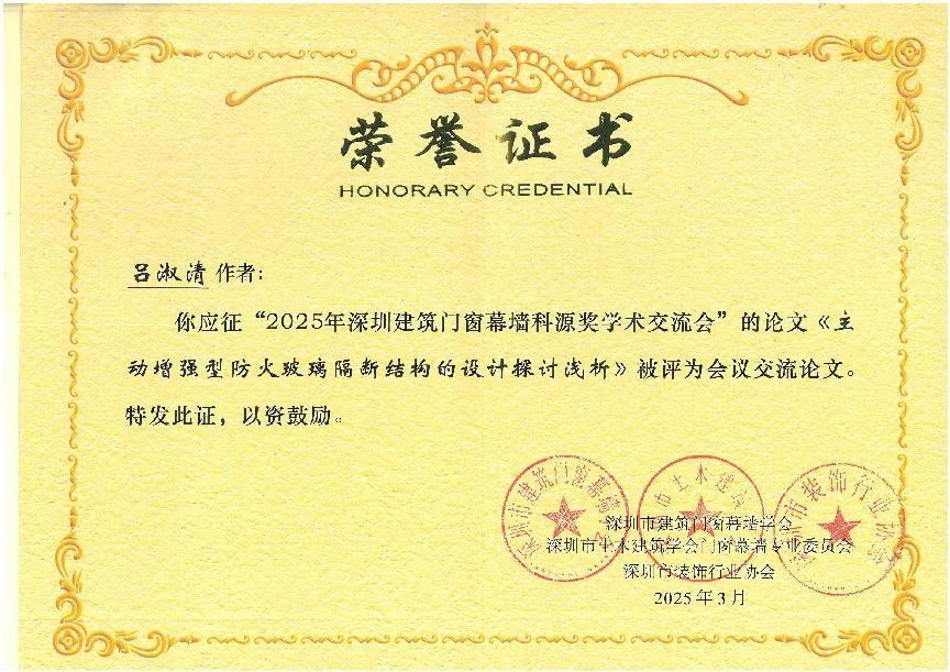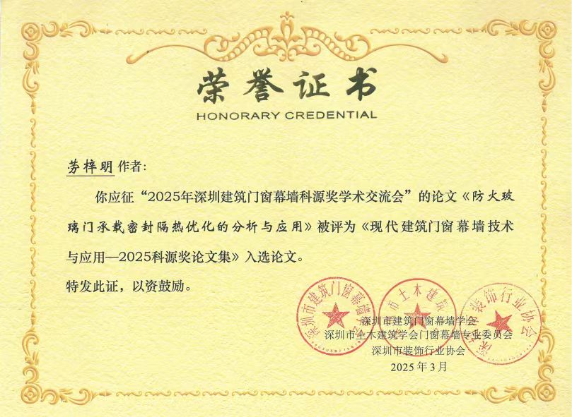 在2025科源獎(jiǎng)獲獎(jiǎng)學(xué)術(shù)論文及學(xué)術(shù)交流先進(jìn)單位頒獎(jiǎng)儀式中,恒保公司共3篇論文榮獲學(xué)會(huì)表彰,其中工程師勞梓明撰寫(xiě)的《防火玻璃門(mén)承載密封隔熱優(yōu)化的分析和應(yīng)用》被評(píng)為《現(xiàn)代建筑門(mén)窗幕墻技術(shù)與應(yīng)用——2025科源獎(jiǎng)?wù)撐募啡脒x論文!